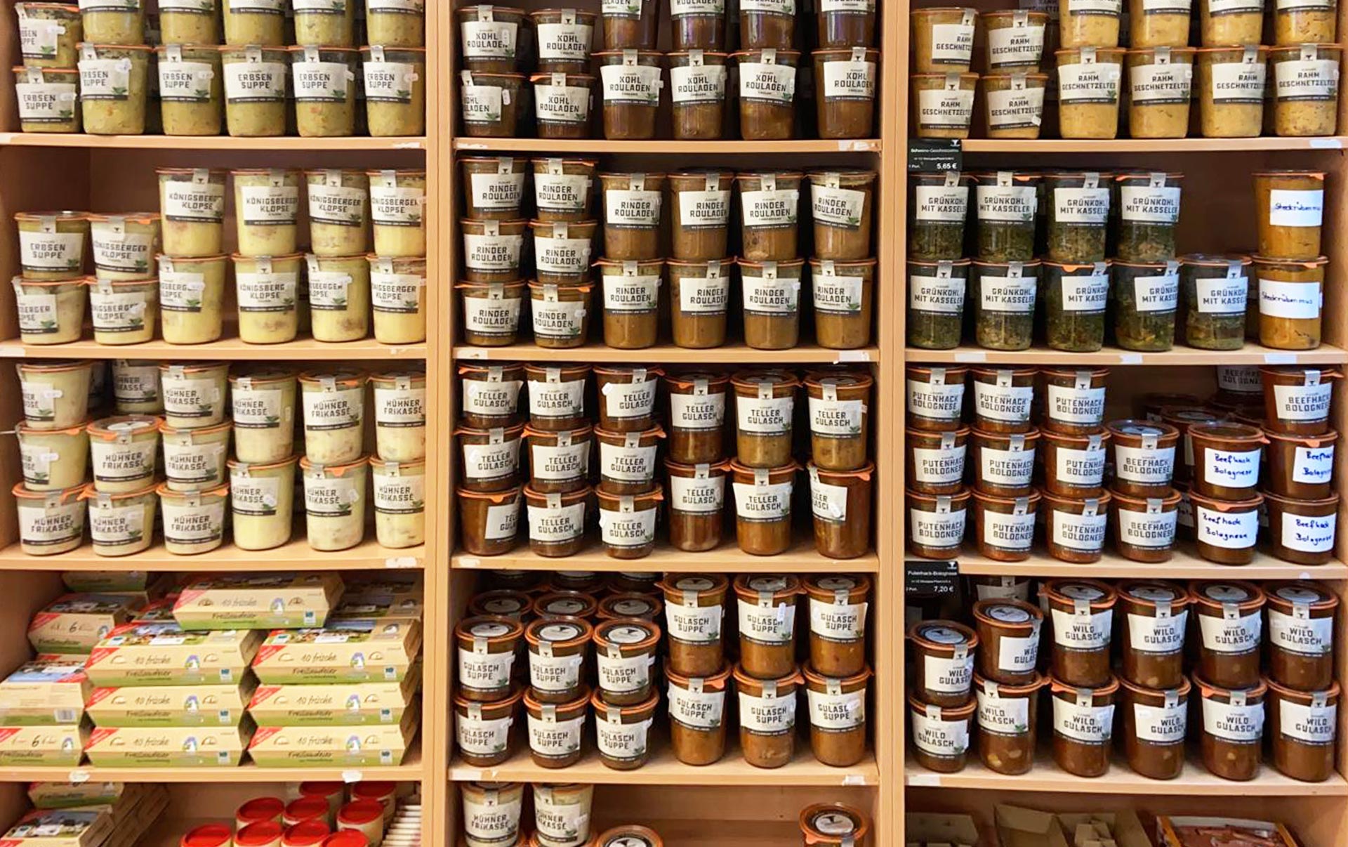 Besondere Beliebtheit erfahren unsere traditionellen Gerichte im Original-Weck-Glas. Wir fertigen Sie nach alten Familienrezepten mit dem guten alten Geschmack. In jedem Glas sind 1 oder 2 Portionen (groß oder klein) enthalten. Wir legen Wert auf beste Zutaten. Das Fleisch stammt ausschließlich von Tieren aus unserer Region. Die Weck-Gläser sind ohne Kühlung haltbar. Der Inhalt sollte erwärmt und danach genossen werden. Sie erhalten die verschieden Gerichte in unserem Ladengeschäft in Lübeck.